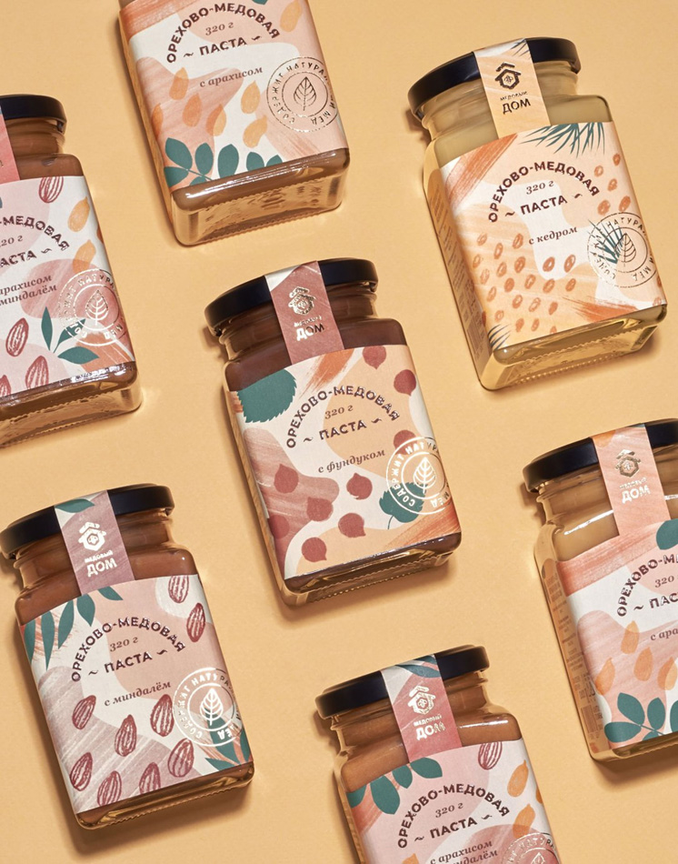 坚果和蜂蜜酱是一种新的健康美味产品,包含五种口味:松子,花生和杏仁,花生,榛子和杏仁。目的是为产品线创建品牌标签。为了强调天然风味并使产品系列与竞争对手区分开来,设计专注于颜色,图形艺术和印刷解决方案。对于每种不同的口味,用柔和的调色板为每种坚果种类创建了独特的图案。未镀膜的质感纸具有清爽的清漆触感,提供令人愉悦的触感体验,而金色的铝箔纸上的光线则唤醒了温暖的夏日夕阳下的影像,这时可以喝一杯含这种甜食的茶就不错了。